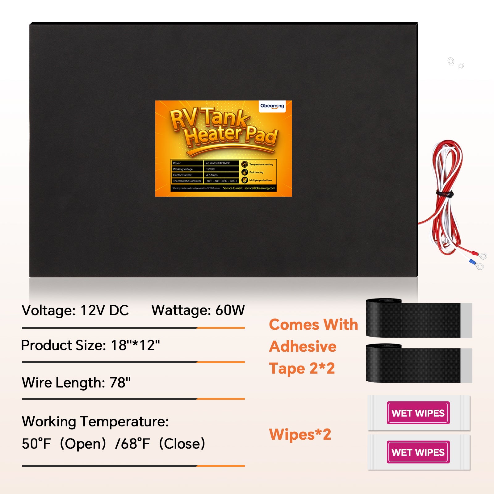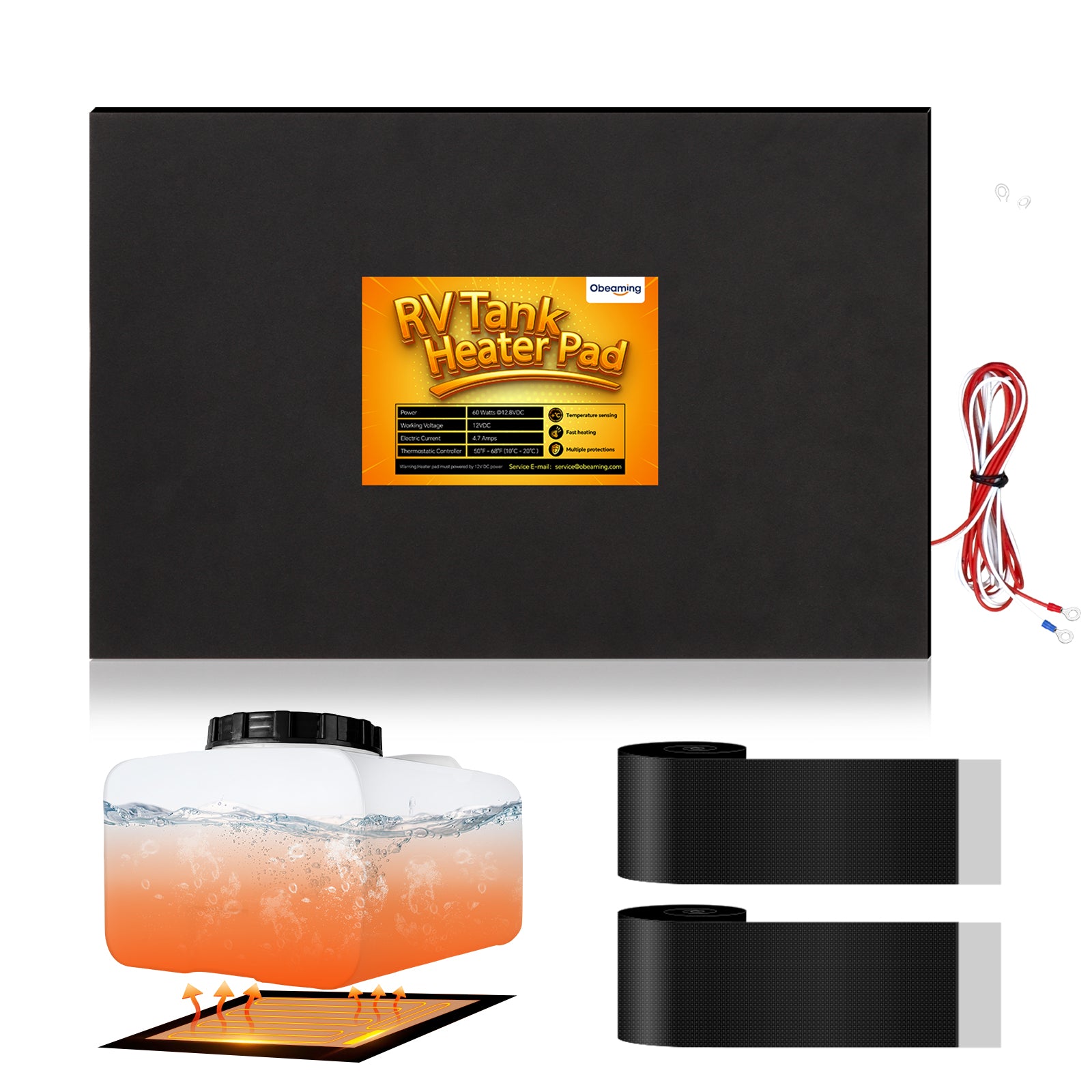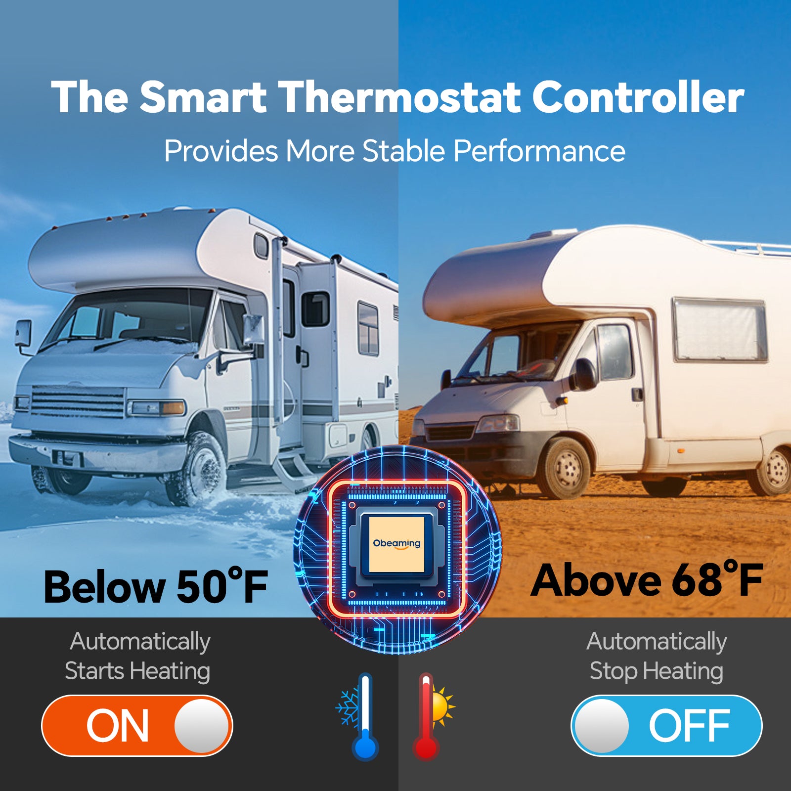 - Intelligent Temperature Control & Use with Peace of Mind: The upgraded Obeaming RV water tank heating pad features precise temperature regulation - it automatically activates at 50°F ± 0.9°F (10°C ± 0.5°C), heating the water tank slightly earlier than other ordinary heating pads. This design will help prevent the risk of the water tank freezing in extremely low temperatures. It will automatically shut off at 68°F ± 0.9°F (20°C ± 0.5°C) to conserve battery power, avoiding unnecessary energy waste