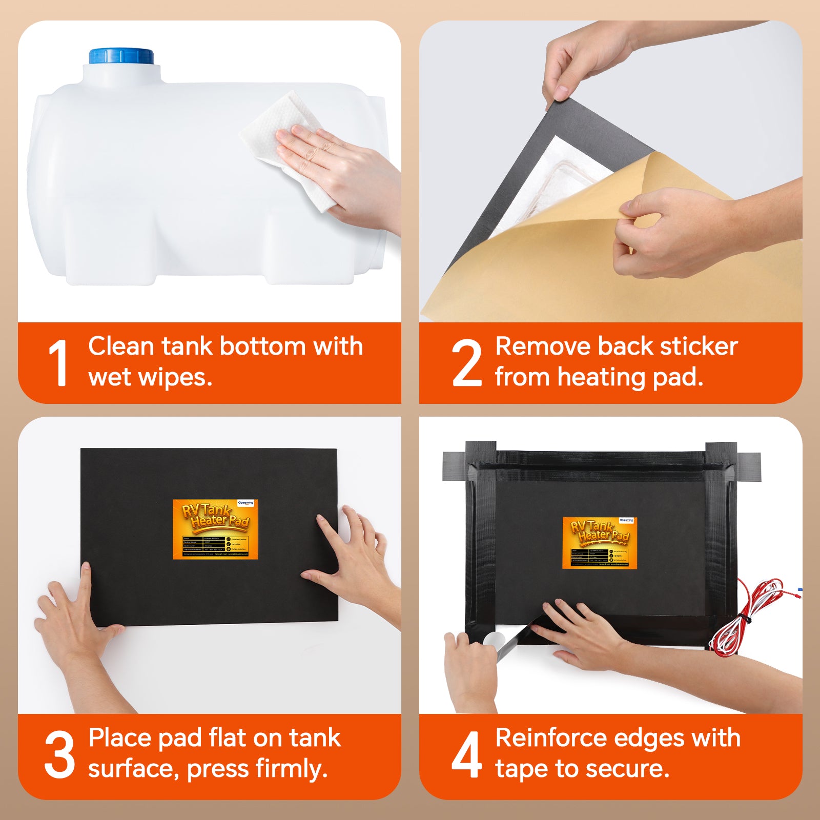 - Easy and Worry-free Installation: Installation is simple—attach the heating plate and insulation to the bottom of your RV water tank and secure it with the included tape. Connect power using the red wire (positive +) and white wire (negative -). A built-in reverse polarity protection feature prevents operation if the wires are connected incorrectly, safeguarding both the device and your RV’s electrical system