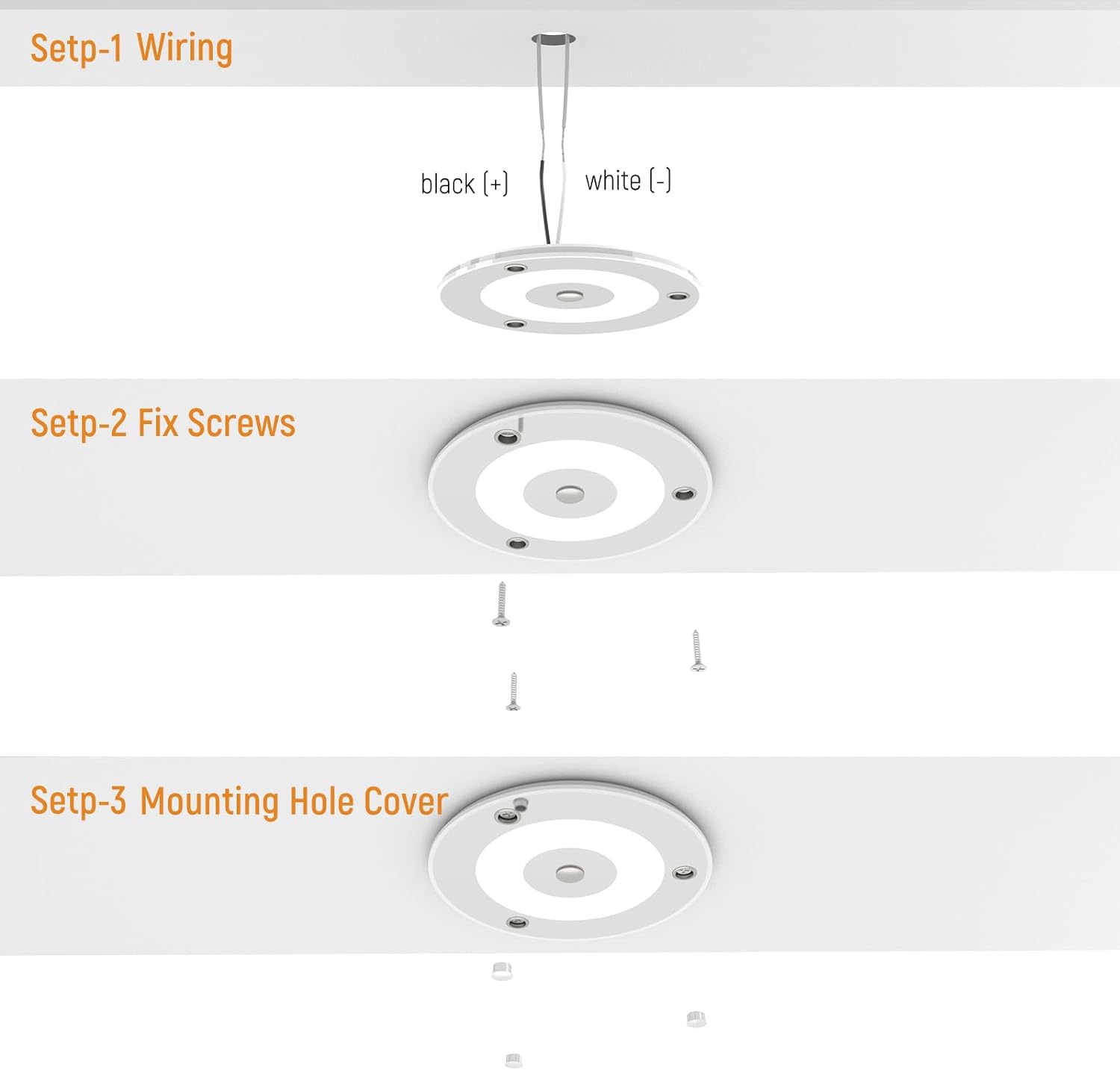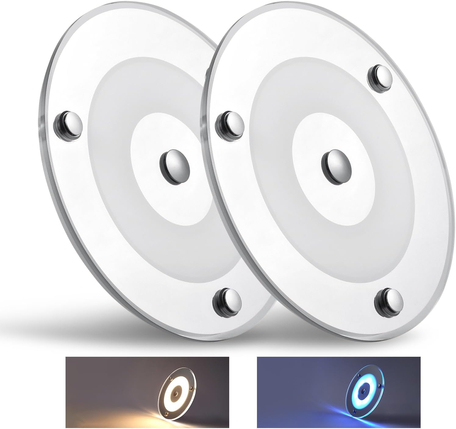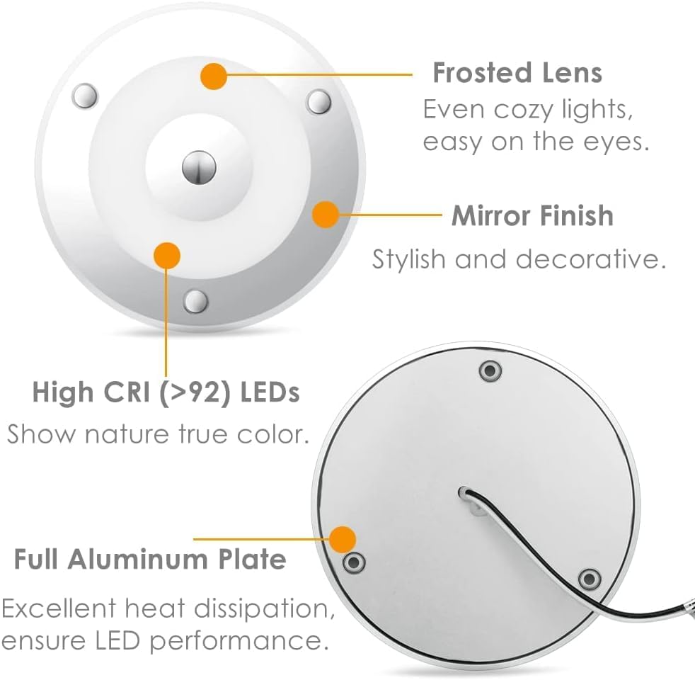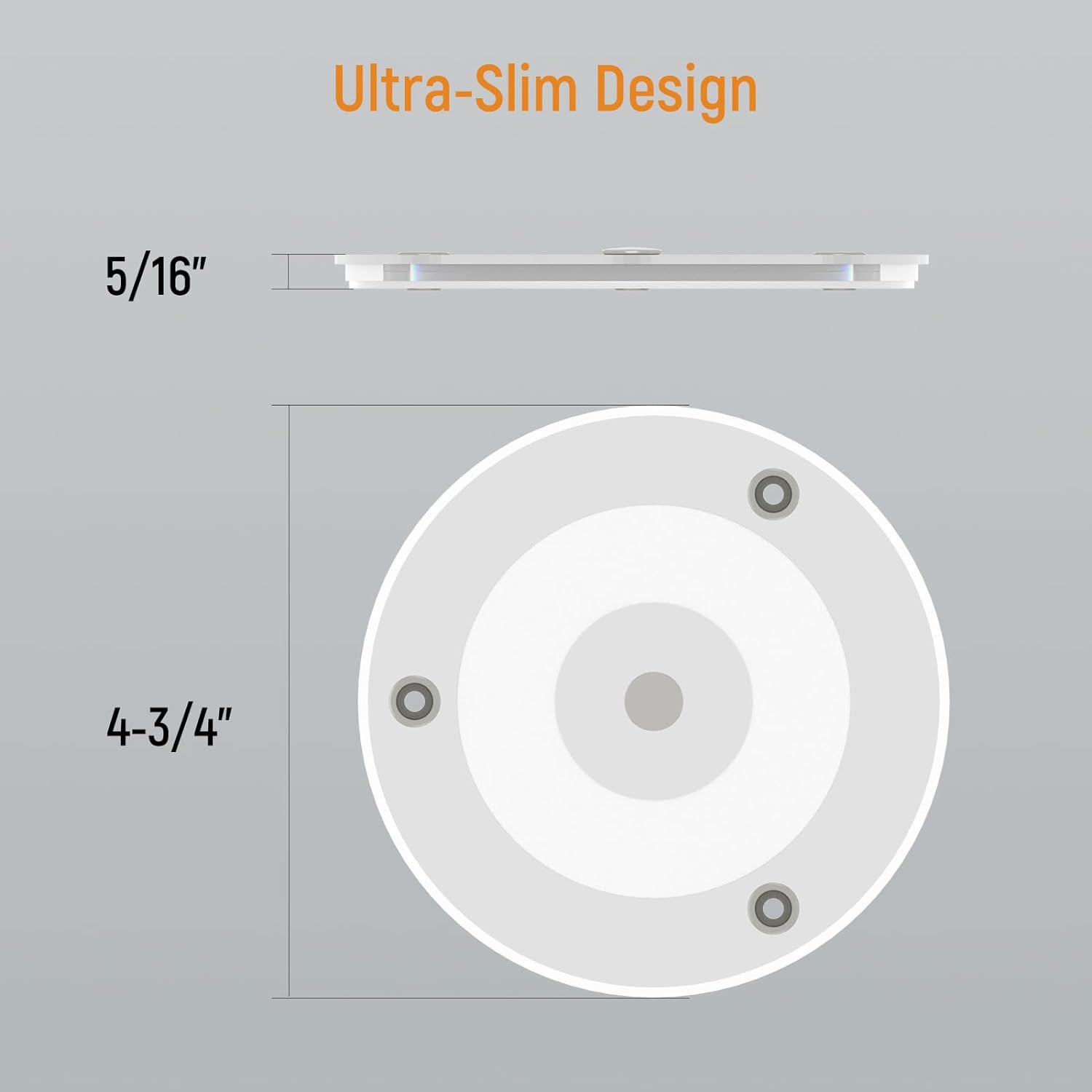 This ultra-slim puck light features a 5/16" thick design that fits perfectly in tight spaces, with a mirror-effect acrylic panel that serves both functional and decorative purposes. Each light comes with an integrated touch dimmer switch for individual on/off and brightness control, eliminating the need for separate switches. The dual-color LEDs provide dimmable white light for general illumination and soft blue light for nighttime ambiance. Constructed from aluminum LED boards and mirror-finish acrylic panels, the lightweight design is vibration and shock resistant. Installation is simple with three screws and included polished screw caps for a clean finish.