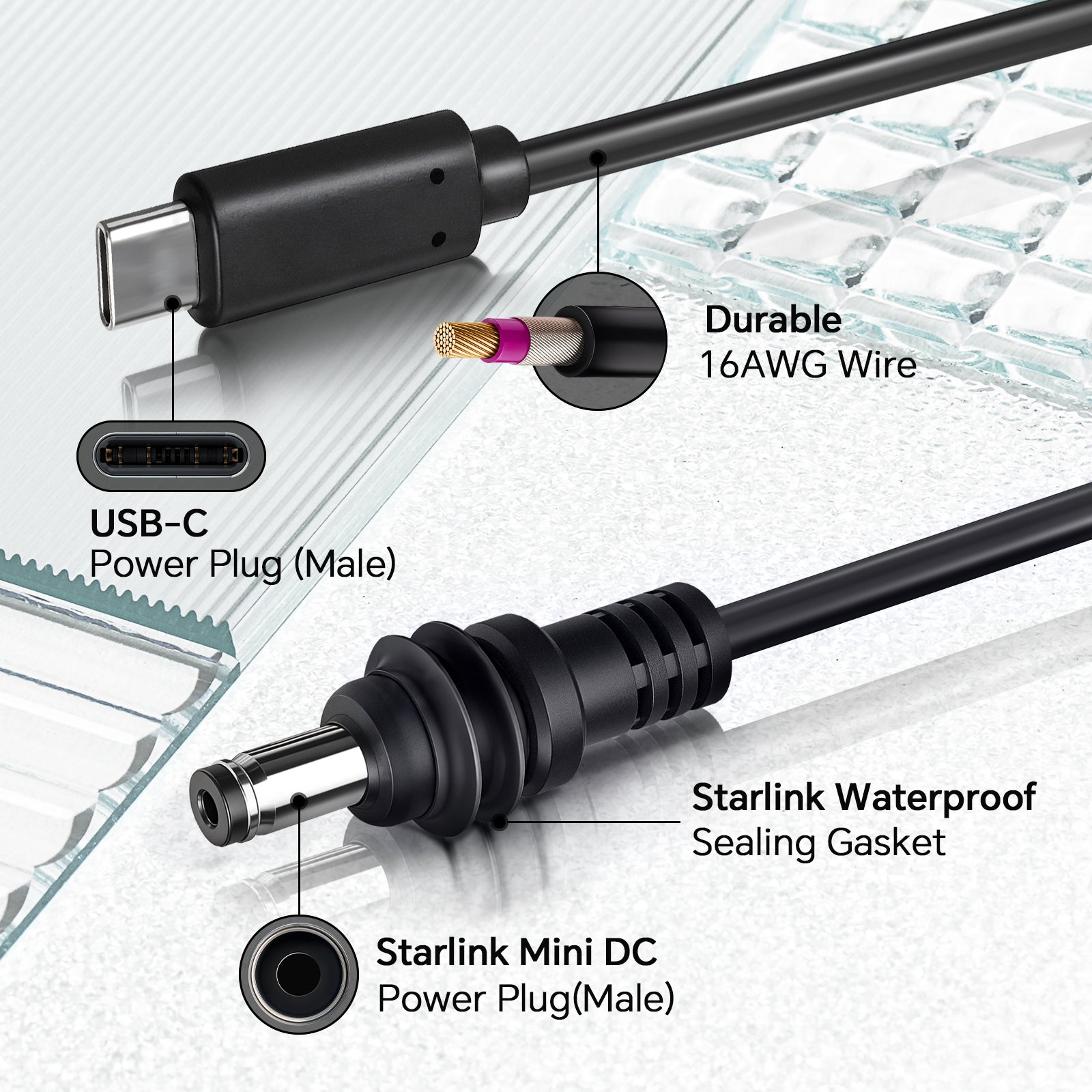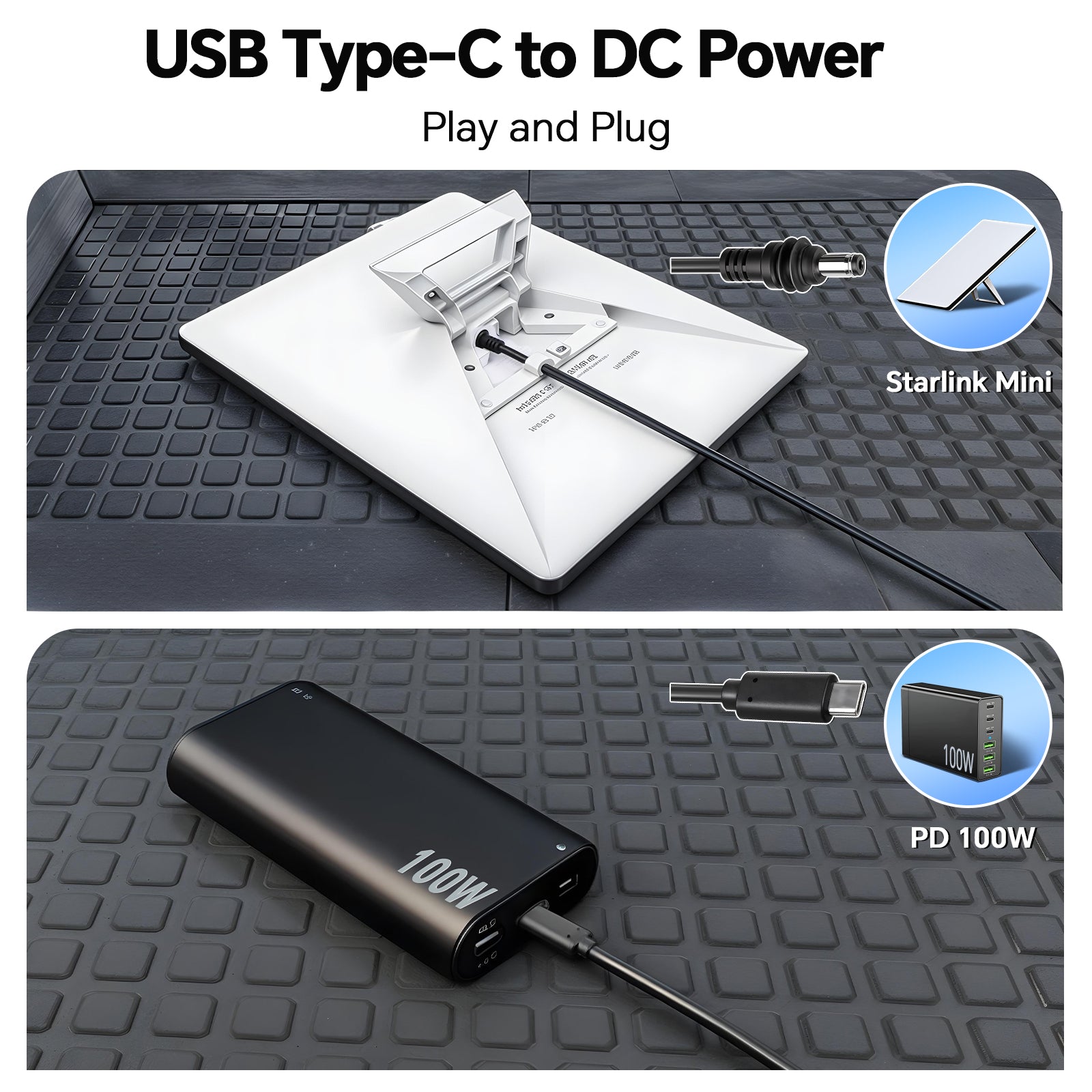 The Obeaming Starlink Mini power cable delivers seamless compatibility through its precision-engineered interface design, working flawlessly with high-capacity power banks (100W+) and 20V PD fast chargers without requiring adapters. Its durable construction features a USB-C male connector and waterproof barrel jack with proprietary gaskets, ensuring reliable indoor/outdoor performance while extending cable lifespan.